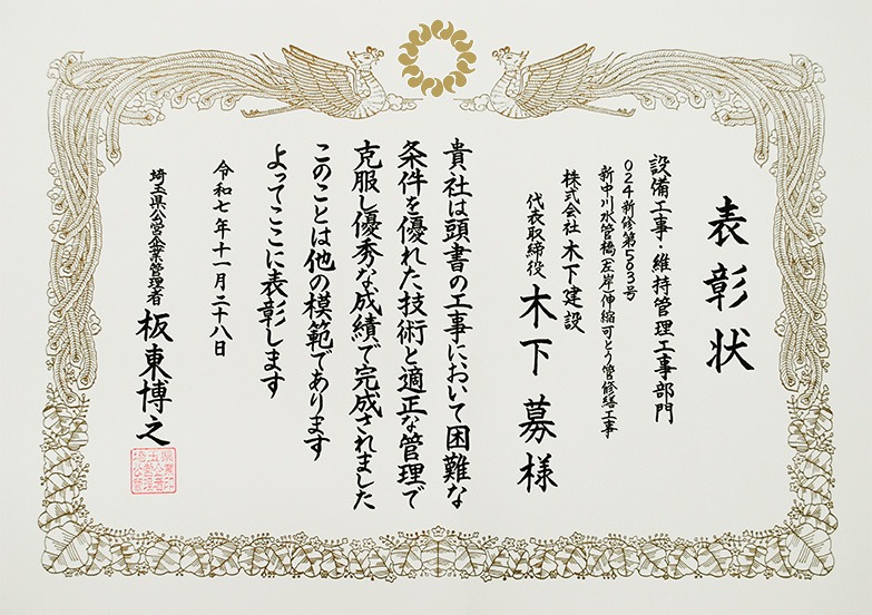 | 埼玉県杉戸県土整備事務所長 | 河川等関連公共施設整備促進工事総合 治水対策特定河川工事合併(柚の木橋下部工) | 優秀建設工事施工者表彰 |