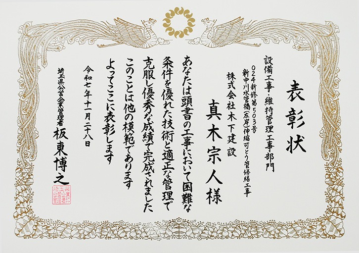 | 埼玉県杉戸県土整備事務所長 | 総合治水対策特定河川工事(姫宮落川姫宮橋下部工) | 優秀工事技術者表彰 |