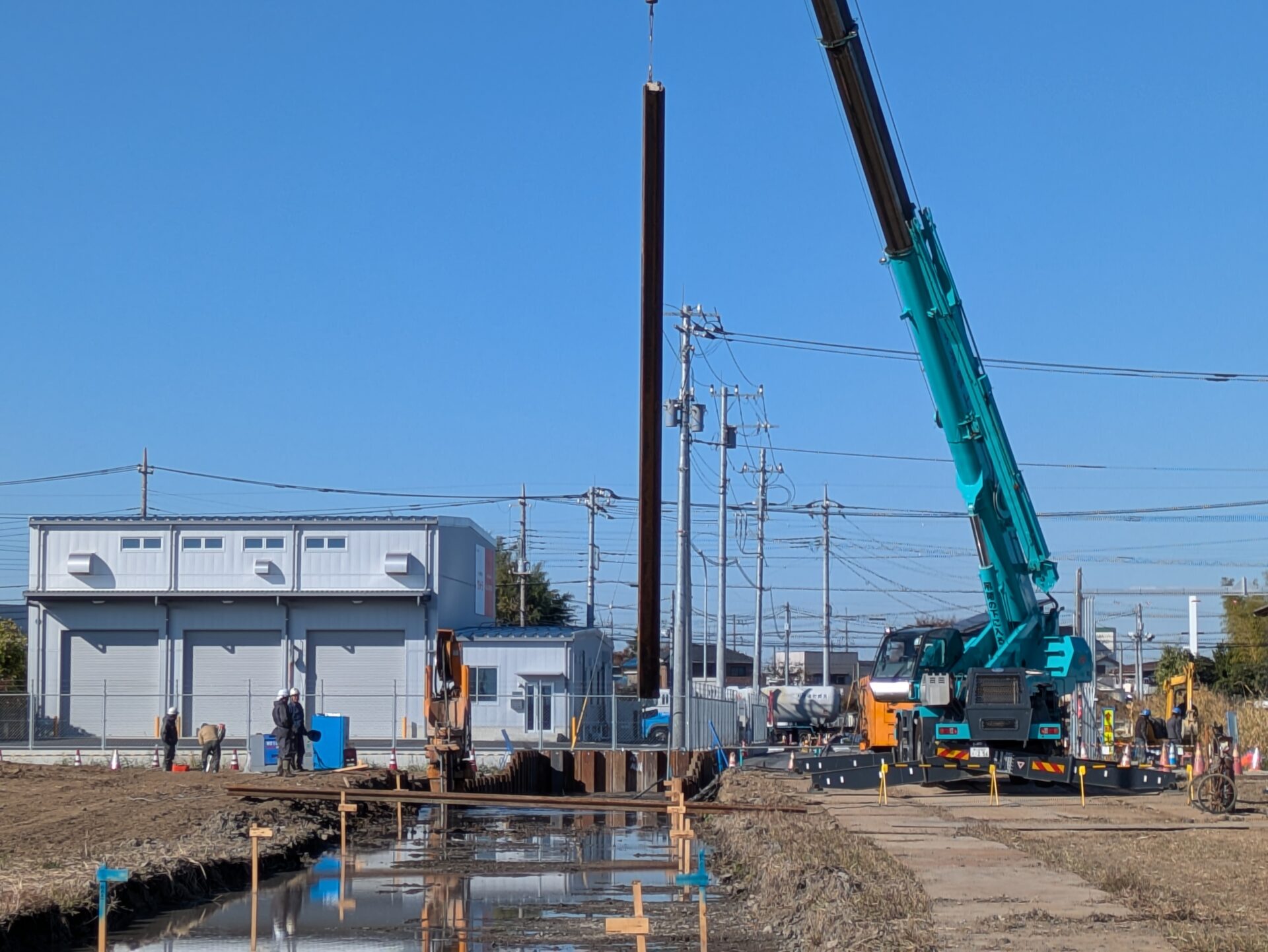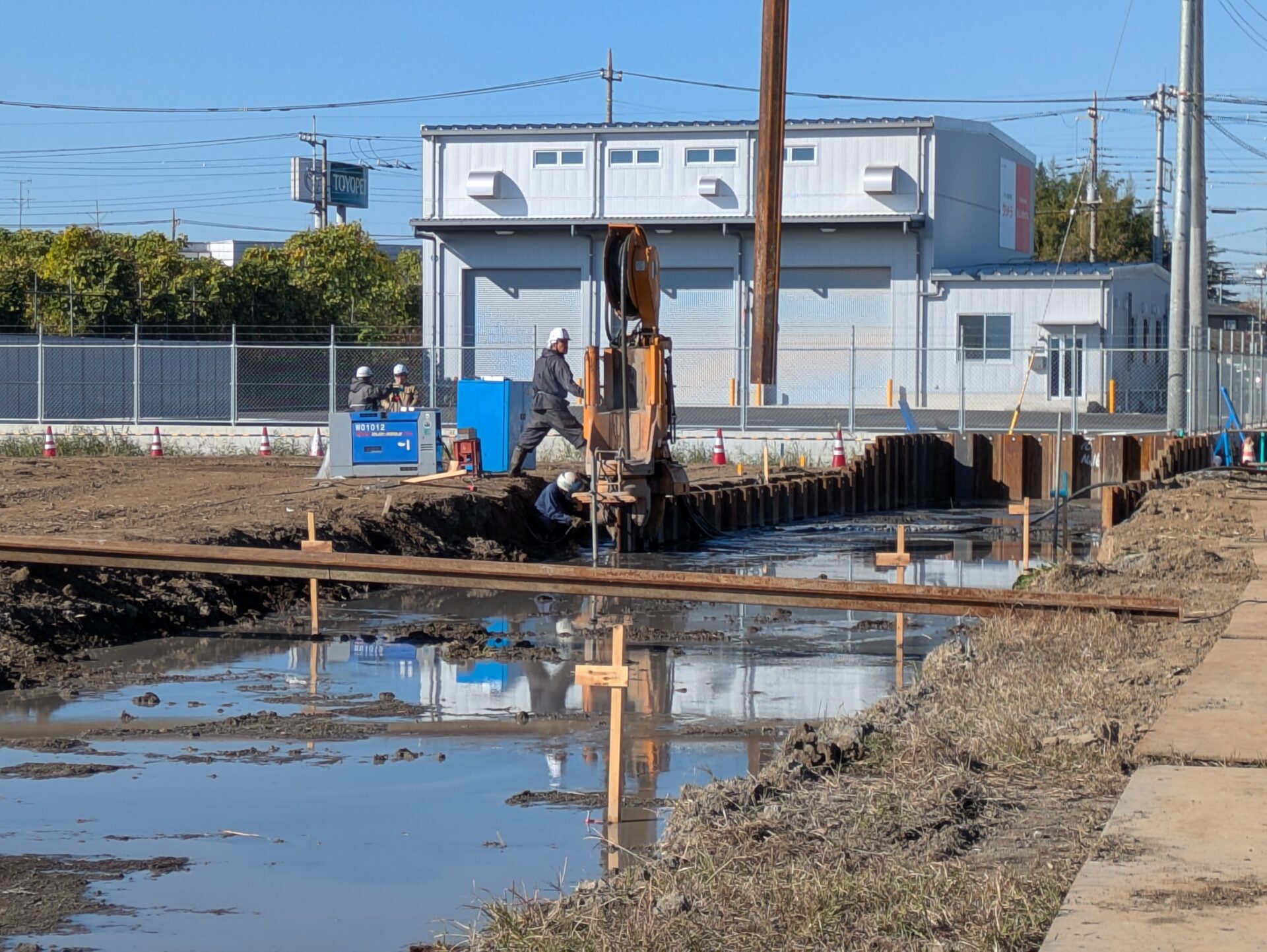 仮設の土留め壁を作っています。安全に工事を進めるための大切な準備作業です。