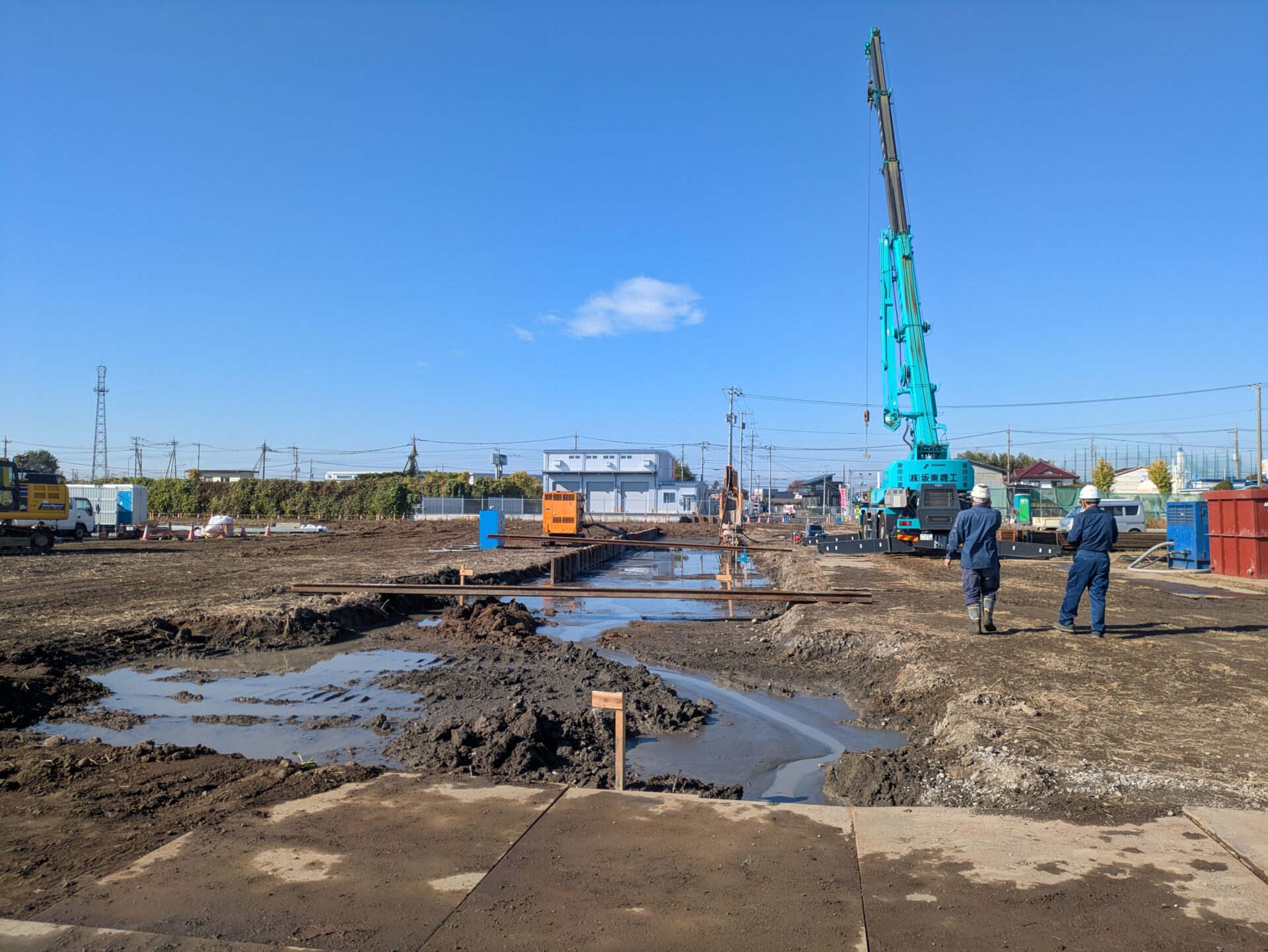 鋼矢板の打ち込みが進み、多くの矢板が設置されました。