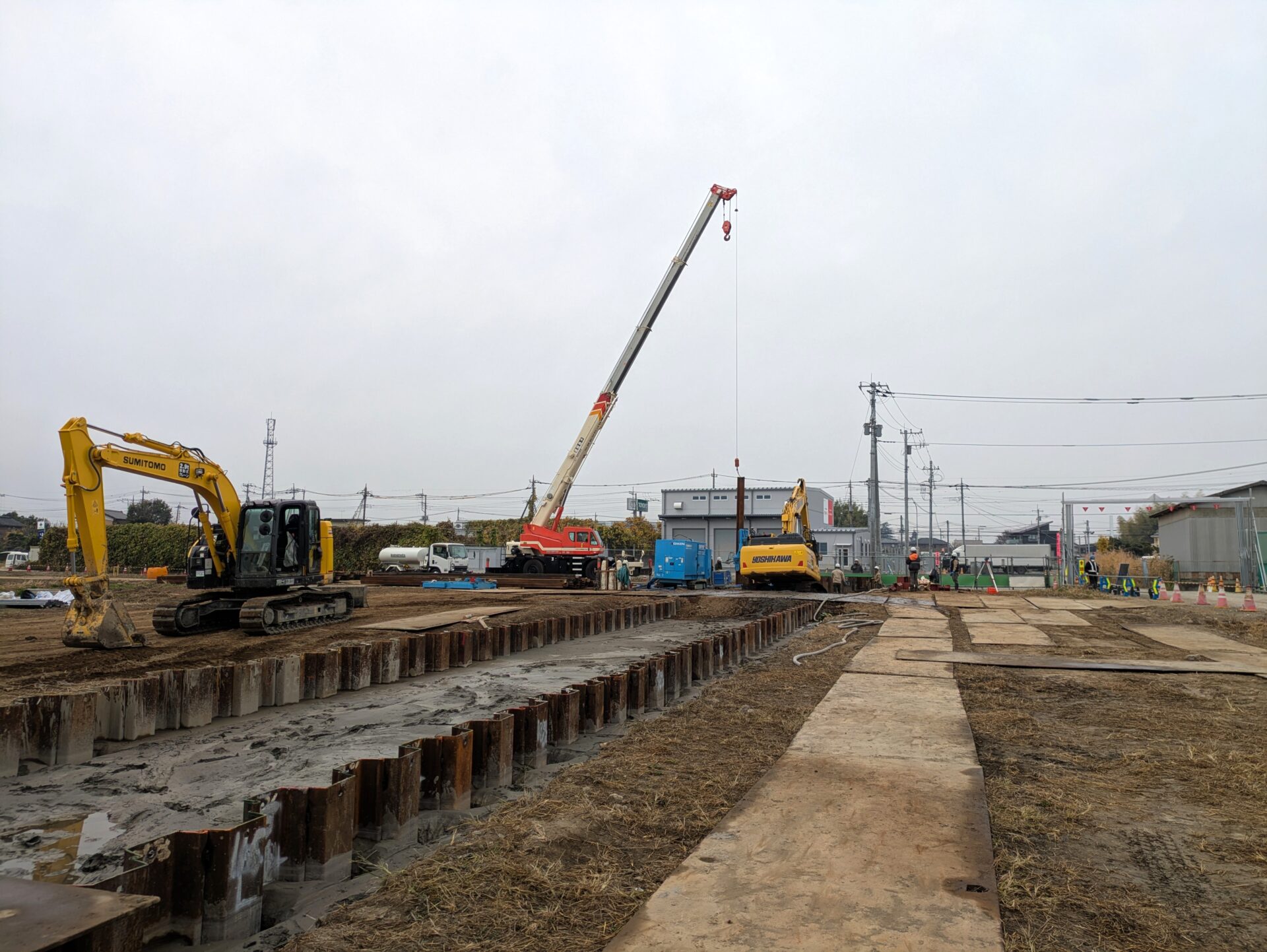 鋼矢板の打ち込み作業が一段落しました。次の工程へ向けて準備を進めています。