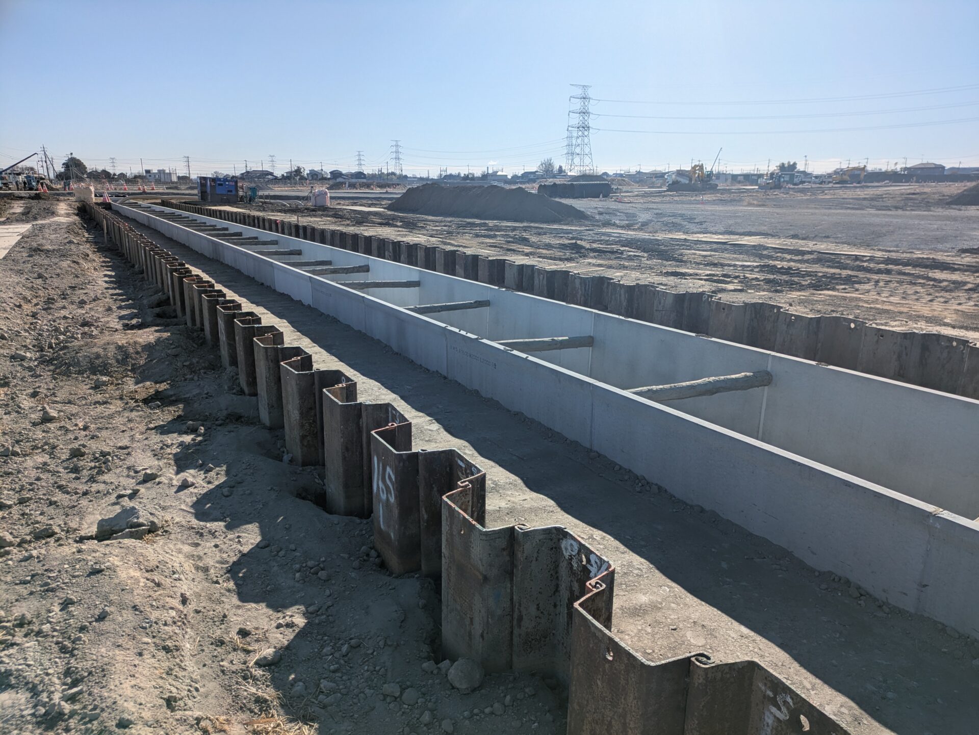 埋め戻しが完了し、鋼矢板の引き抜きの準備をしています。