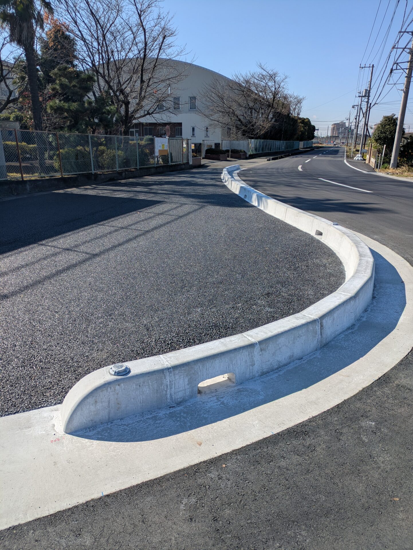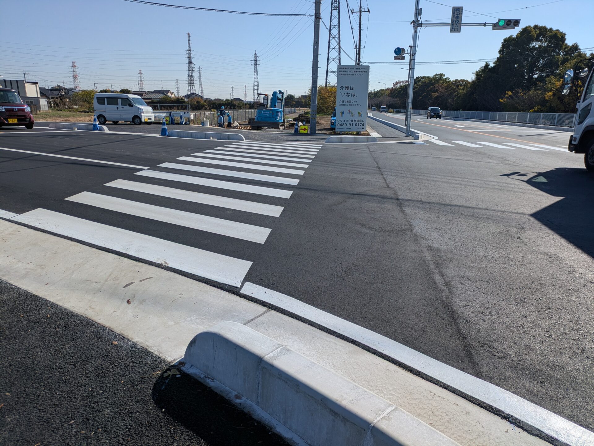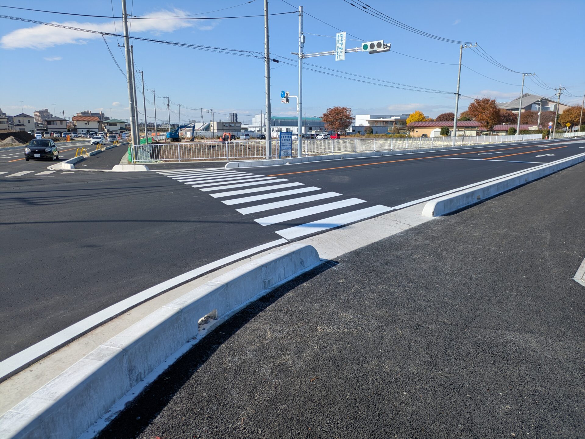 交差点の舗装がほぼ仕上がり、路面がきれいに整いました。