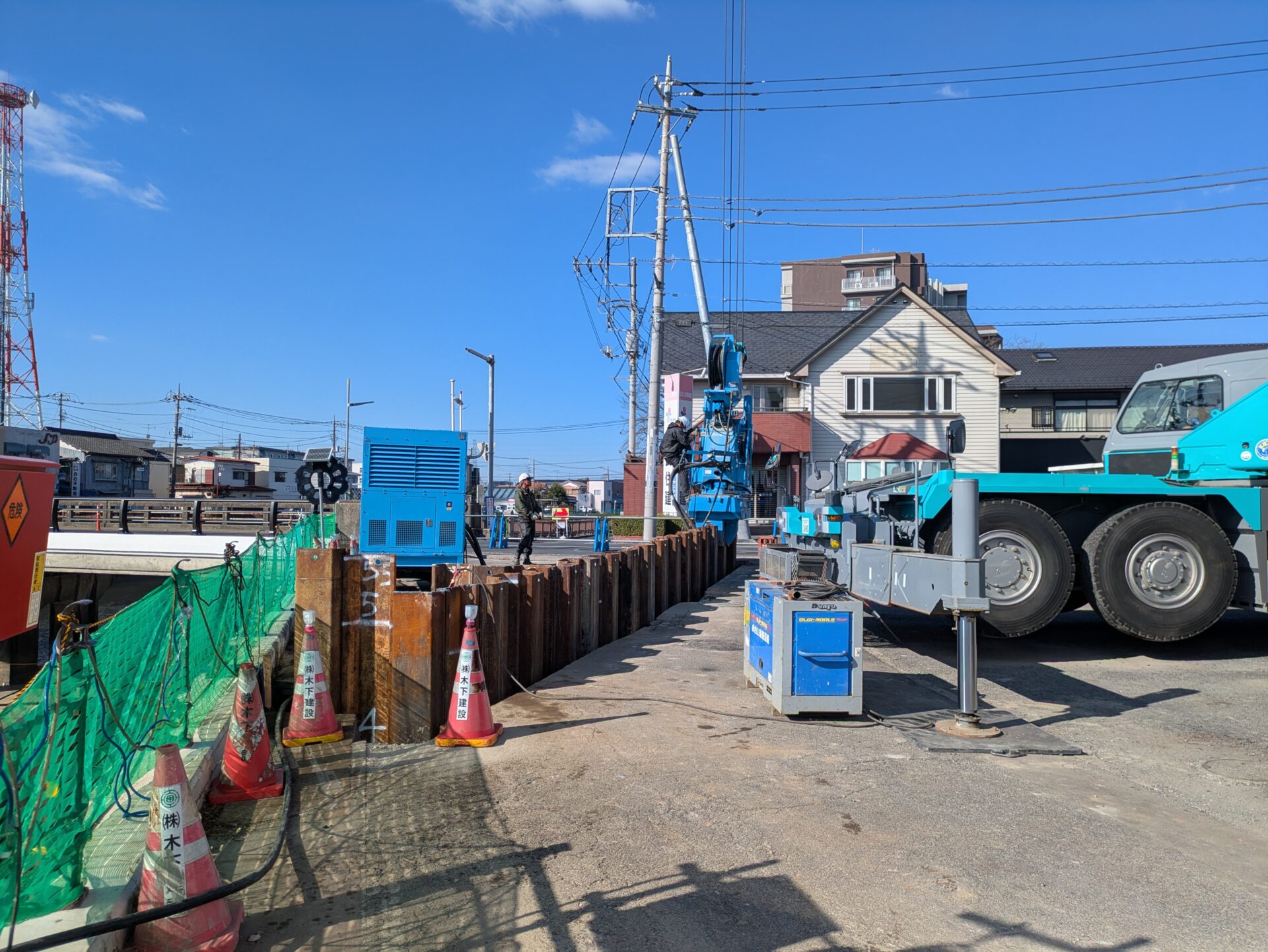 先週とは場所が変わり、橋横での鋼矢板打設の様子です。位置・深さを確認しながら、丁寧に施工を進めています。